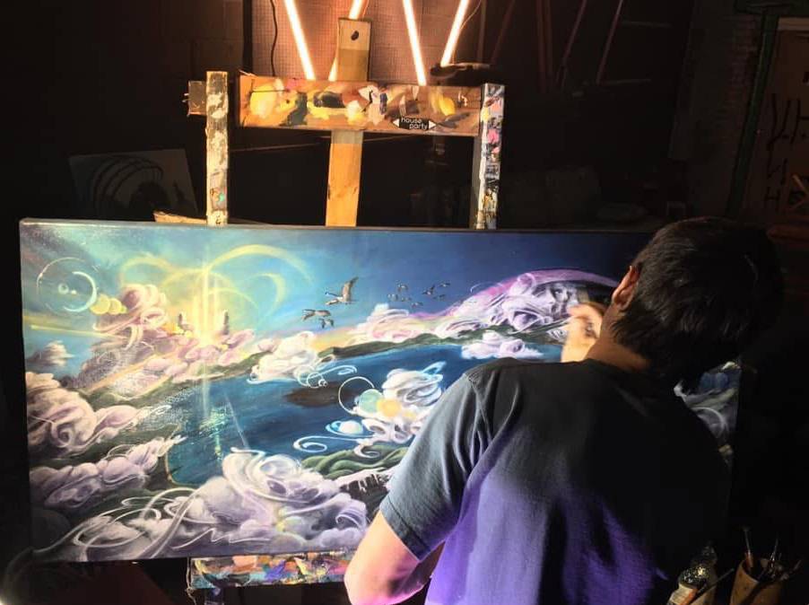 Cool tones of blue, purple, and green meet warm bursts of light and energy, creating a dreamy, high-altitude perspective. There are no reference photos here—just memory, imagination, and a deep love for this place. The painting is all about perspective: the feeling of flying above something familiar and seeing it with new eyes.