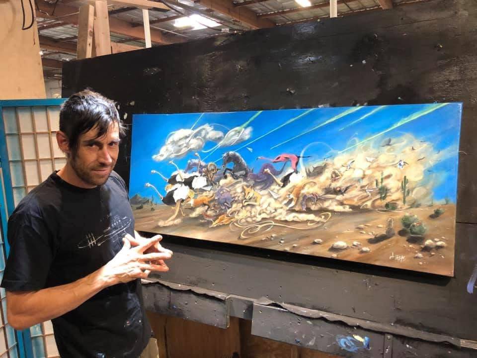 This piece originally began as a vision of an ostrich stampede, but as I continued painting—starting live at an event and later refining it in the studio—it naturally evolved into something much wilder and more spontaneous. What started with one idea turned into a full-on free-for-all, featuring a variety of animals and even a female farmer caught up in the chaos. It became less about control and more about the energy of unpredictability, movement, and playful disorder.