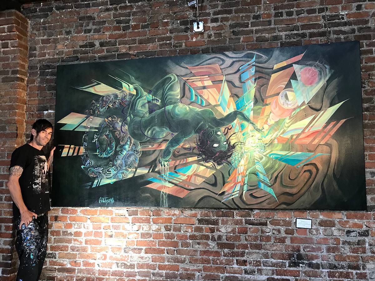 This vision came to me in a dream and was one of the most vivid and intense dreams I’ve ever had….so intense that I couldn’t sleep for days as this image was so alive in my mind. I painted Tranquil in 2014 during a time when I was trying to make sense of inner chaos—when everything felt like it was breaking apart and yet coming together at the same time. The figure in the painting is a female humanoid suspended between two forces: reaching forward into light, into bliss, but still tethered to the storm behind her by a single purple thread. To me, that line is a symbol of how we’re never fully free from where we come from, even as we grow.